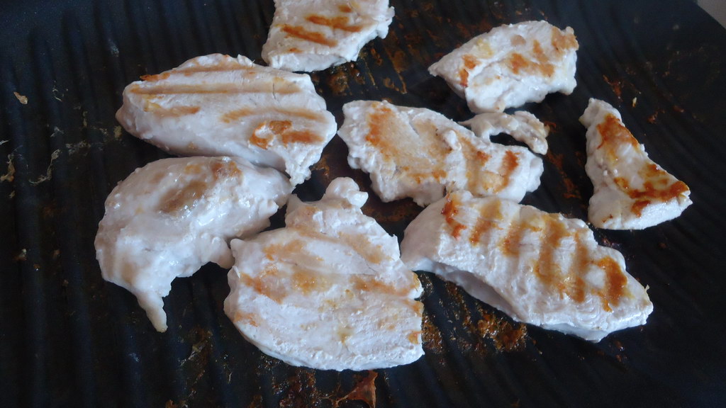 И еще один важный момент, для приготовления этого блюда я использую именно сковороду гриль, полосочки на ней позволяют соку стекать вниз, так курица быстро зажаривается сверху, а внутри остается мягкой и сочной, всё это без применения какого-либо жира. Я думаю, можно попробовать пожарить наггетсы и на обычной сковороде, чугунной или антипригарной, если кто-то пробовал такое, поделитесь пожалуйста опытом!
